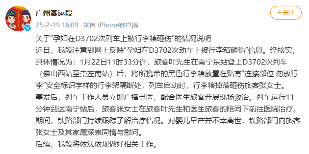 2月19日,中国铁路广州局集团有限公司广州客运段官方微博发布关于“孕妇在D3702次列车上被行李箱砸伤”的情况说明: