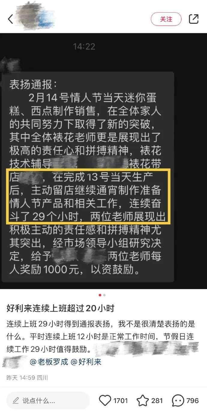 通报中称,两名员工“主动留店通宵制作准备情人节产品和相关工作,连续奋斗了29个小时,展现出积极主动的责任感和拼搏精神尤其突出,经市场领导小组研究决定,给予每人奖励1000元,以资鼓励。” 并要求统计当天工作超过20小时的人员名单。