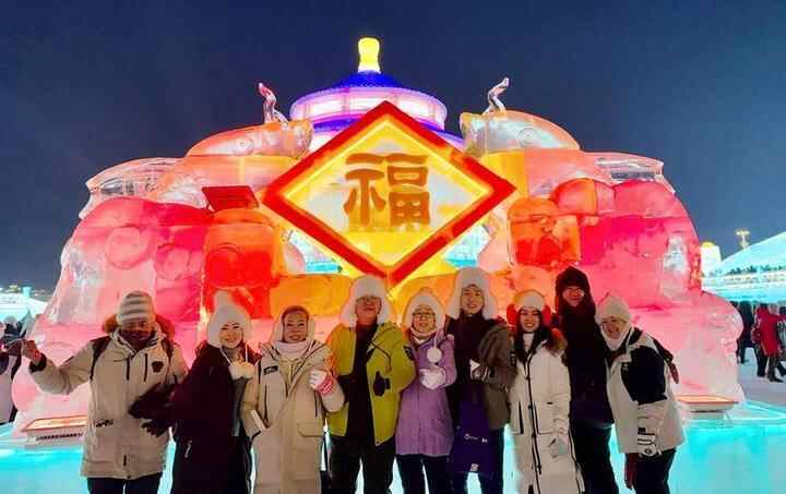 2月1日,马来西亚游客陈新全(右四)在黑龙江省哈尔滨冰雪大世界游玩时与旅行团友合影(受访者提供)。