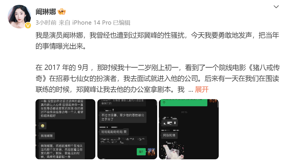 就在小雨接受羊城晚报记者采访时,另一位参演《猪八戒传说》的女演员阚琳娜也公开发文,详细讲述了自己被郑某峰猥亵的经过。与小雨的经历相似,阚琳娜也提及郑某峰曾对她说“陪他睡觉就可以演女一号”。她在文中表示,电影中“七仙女”的扮演者,“有六个人都遭受过他的种种行为”。