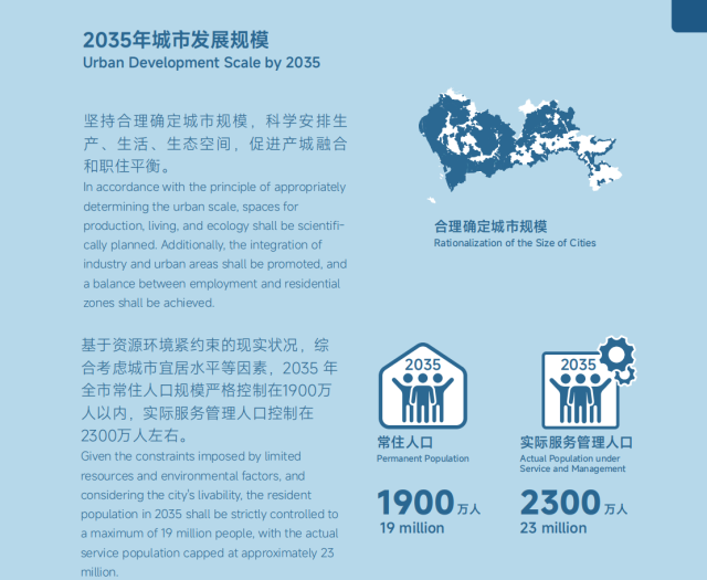 《总体规划》还提出,基于资源环境紧约束的现实状况,综合考虑城市宜居水平等因素,2035年全市常住人口规模严格控制在1900万人以内,实际服务管理人口控制在2300万人左右,常住人口城镇化率100%,户籍人口占常住人口比例达到50%以上。
