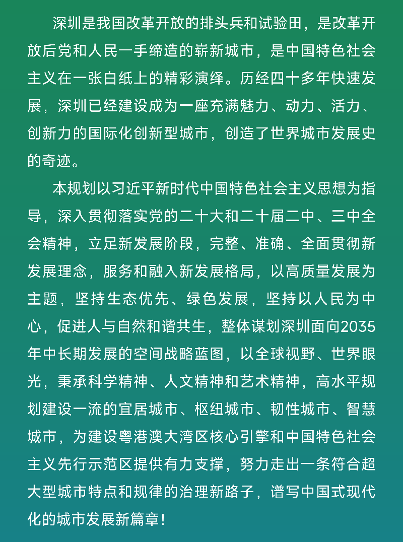 本轮《总体规划》是深圳经济特区建立以来的第四版法定总体规划,也是深圳首部多规合一的总体规划,以高质量发展为主题,坚持生态优先、绿色发展,坚持以人民为中心,促进人与自然和谐共生,整体谋划深圳面向2035年中长期发展的空间战略蓝图,以全球视野、世界眼光高水平规划建设一流的宜居城市、枢纽城市、韧性城市、智慧城市,为建设粤港澳大湾区核心引擎和中国特色社会主义先行示范区提供有力支撑。