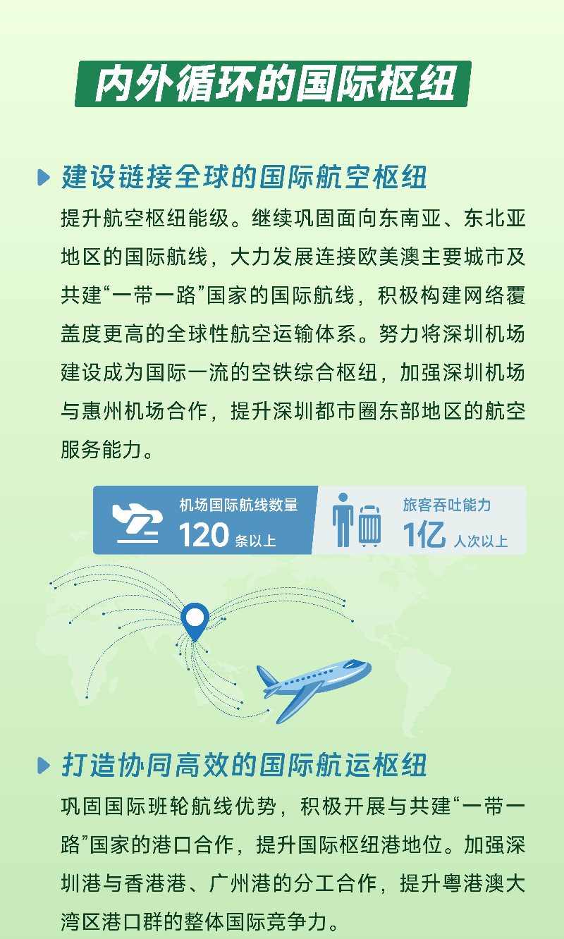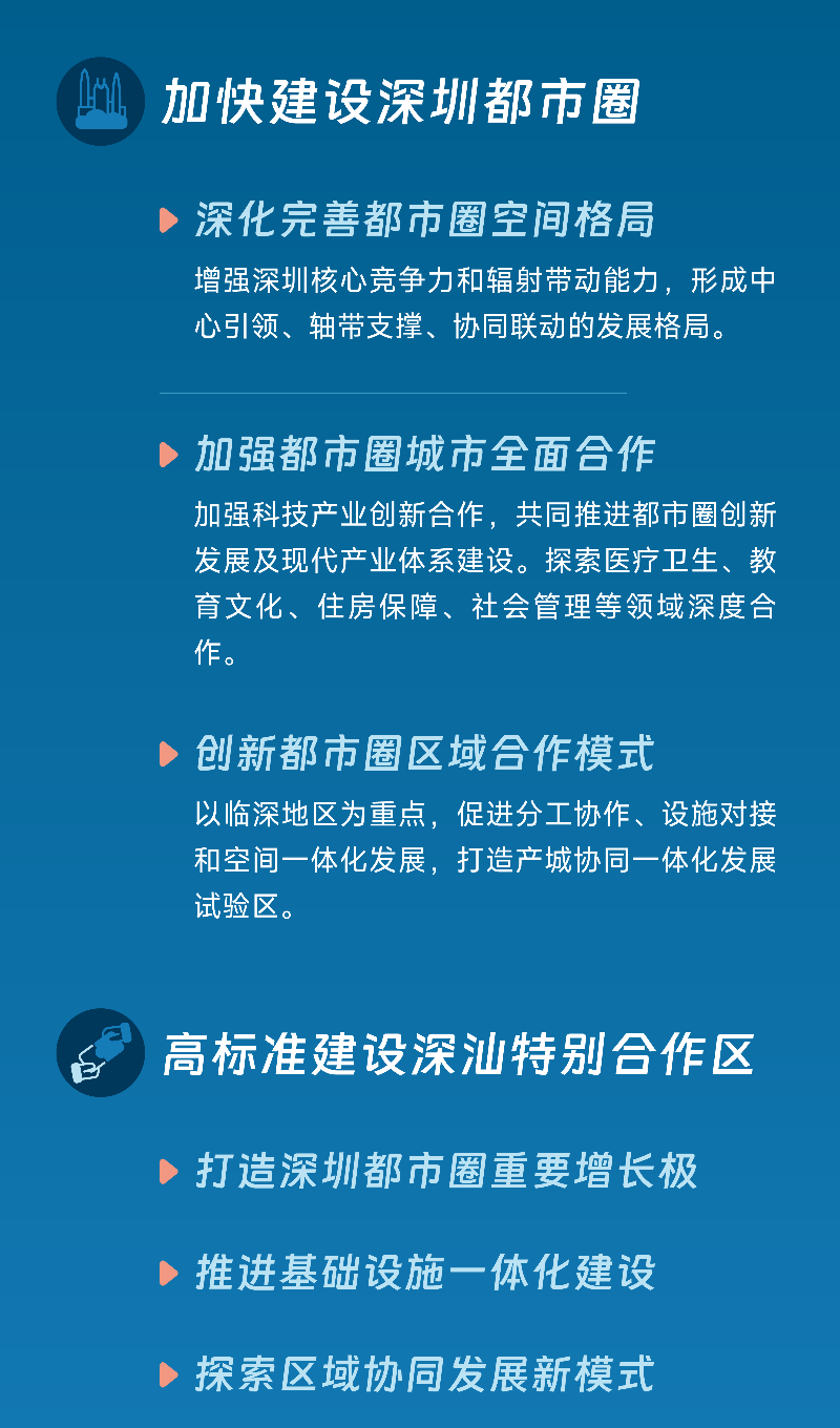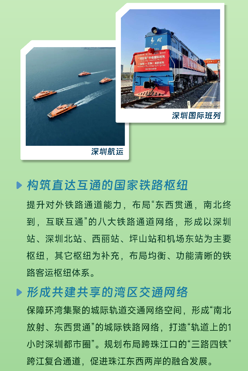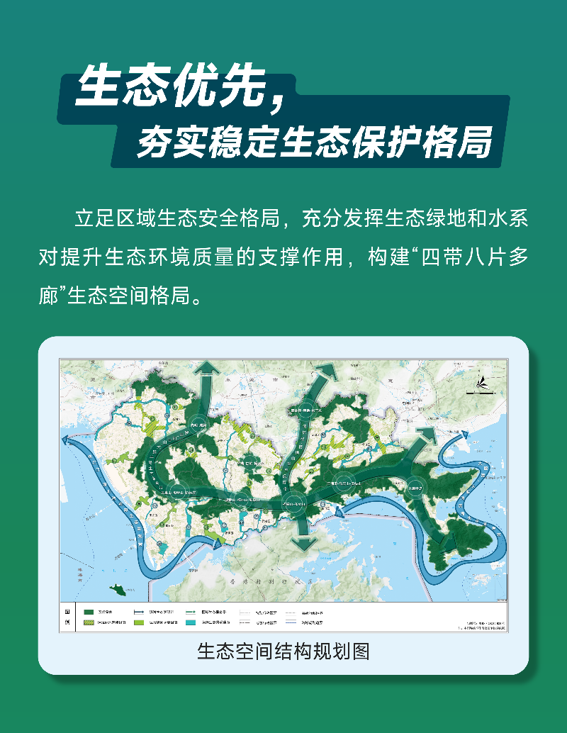 《总体规划》提出,划定与管控三条控制线,构建“四带八片多廊”生态空间格局;构建“一核多心网络化”城市空间格局,促进都市核心区扩容提质,打造12个城市功能中心,培育12个城市功能节点;构建现代产业体系,完善产业空间布局,打造“1+7+N”全域创新空间格局;建设链接全球的国际航空枢纽,打造协同高效的国际航运枢纽,构建辐射全国的国家铁路枢纽,共建互联互通的湾区交通网络;加强深港澳紧密合作,推动珠三角城市融合发展,加快建设深圳都市圈,高标准建设深汕特别合作区等。