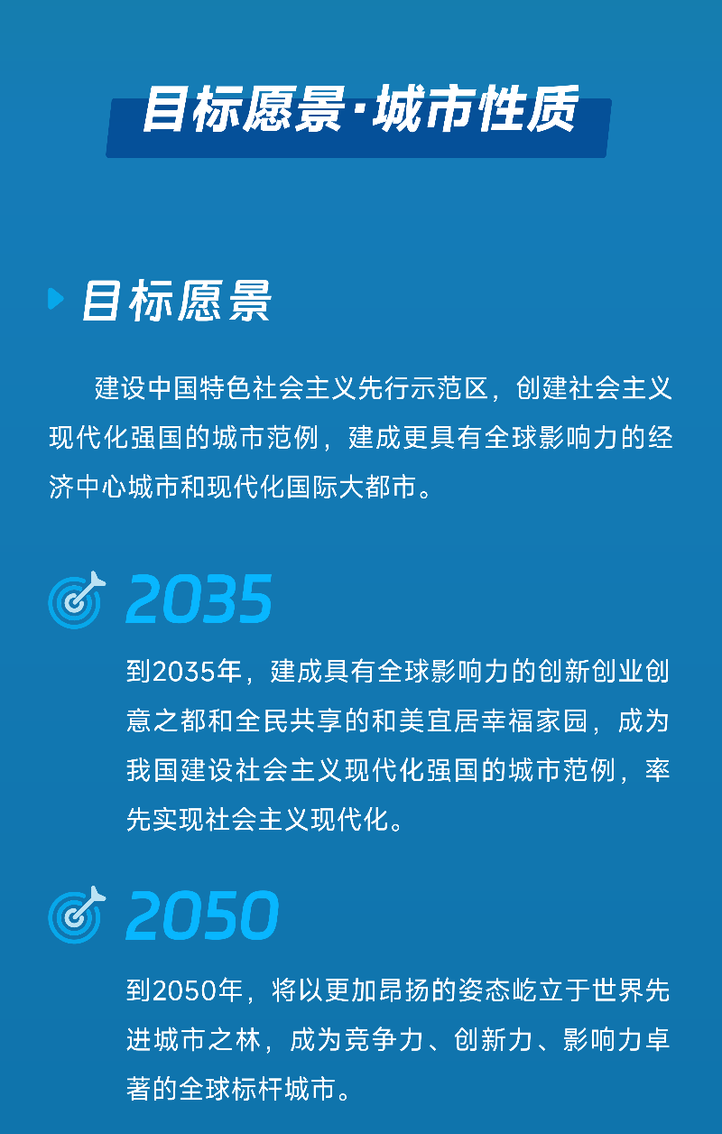 《总体规划》明确,深圳市的城市性质为经济特区、国家创新型城市、现代海洋城市、国际性综合交通枢纽城市。核心功能定位是全国性经济中心、全国先进制造业基地、对外开放门户、国际科技创新中心重要承载地。目标与愿景为“建设中国特色社会主义先行示范区,创建社会主义现代化强国的城市范例,打造高质量发展高地、法治城市示范、城市文明典范、民生幸福标杆、可持续发展先锋,成为竞争力、创新力、影响力卓著的全球标杆城市。”