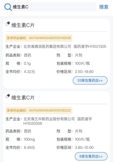 第四步:以搜索维生素C为例,可以看到下方展示了在售的相关商品及价格等信息。