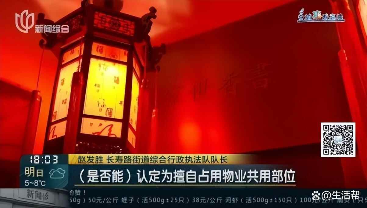赵发胜 长寿路街道综合行政执法队队长:“这个灯笼一时无法判断认定为擅自占用物业共用部位,因为这么多年下来没有案例,包括房地部门文件也没有这方面解释,就门口挂了装饰品,从另外一个角度来讲,有可能违反公序良俗。”