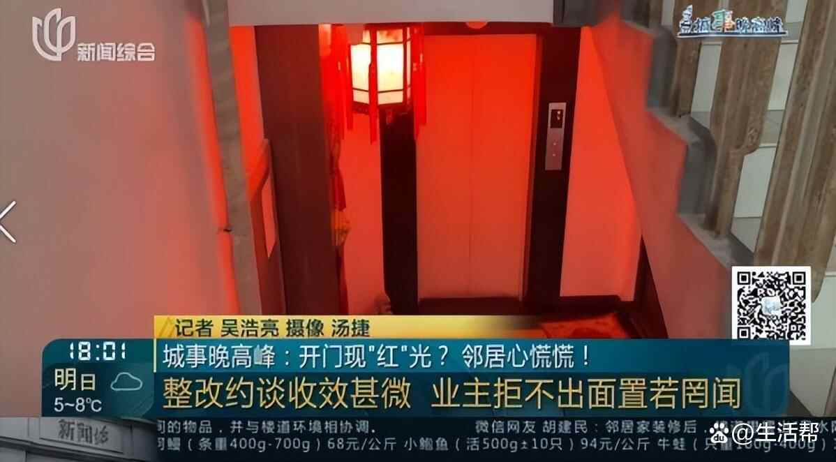 杨邹华 上海申道律师事务所主任律师:“红光的环境下,对其他邻居一定会造成比较大的影响,这种光线更多是感官上面的难受,所以我们通过相邻权要求他把灯,包括灯笼全部拿掉,我相信把消防管道放在外面,有设计道理的,擅自做包裹,包括这个棱角,将来如果发生火灾,在拖相关管子的时候,会不会对救援造成影响。”