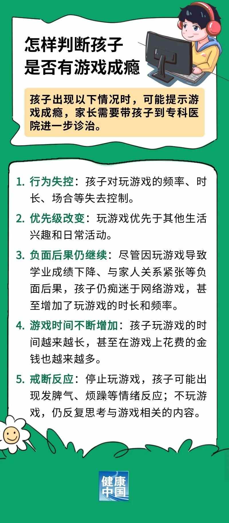 如今,孩子接触网络游戏的机会越来越多,有的甚至沉迷其中。殊不知 ,过度玩游戏可能导致游戏成瘾,对孩子的身心健康产生严重的影响。