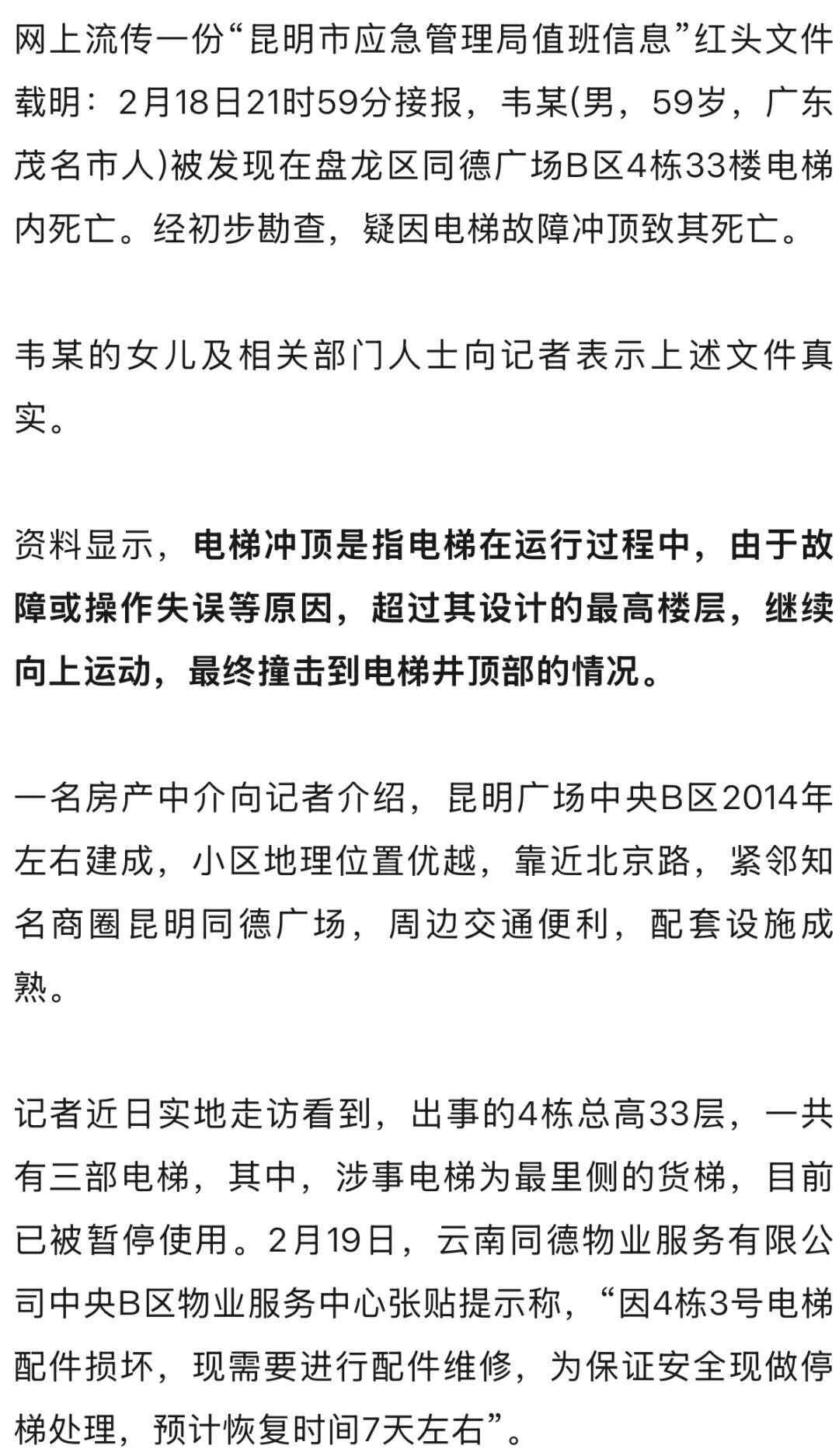 2月18日晚间,云南省昆明市盘龙区昆明广场中央B区4栋的电梯疑因故障冲顶,导致59岁的业主韦某不幸身亡。