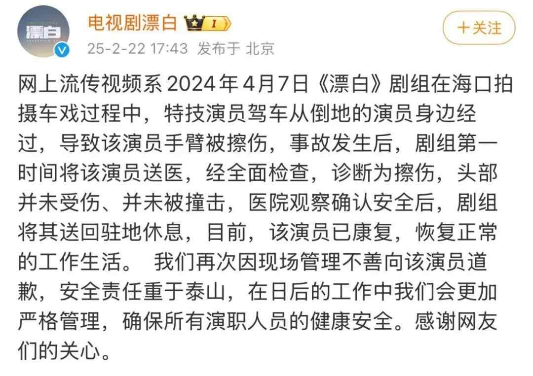 我们再次因现场管理不善向该演员道歉,安全责任重于泰山,在日后的工作中我们会更加严格管理,确保所有演职人员的健康安全。感谢网友们的关心。