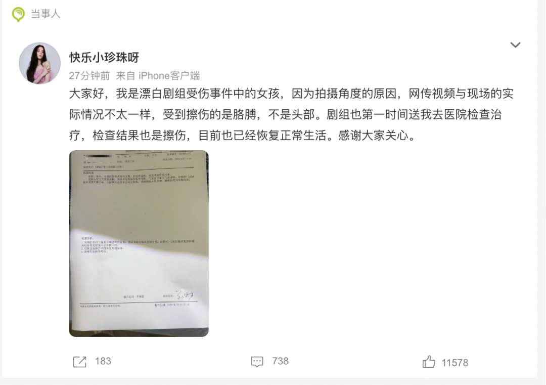随后,自称为当事替身演员,微博ID为“快乐小珍珠呀”的账号发文回应:“大家好,我是漂白剧组受伤事件中的女孩,因为拍摄角度的原因,网传视频与现场的实际情况不太一样,受到擦伤的是胳膊,不是头部。剧组也第一时间送我去医院检查治疗,检查结果也是擦伤,目前也已经恢复正常生活。感谢大家关心。”