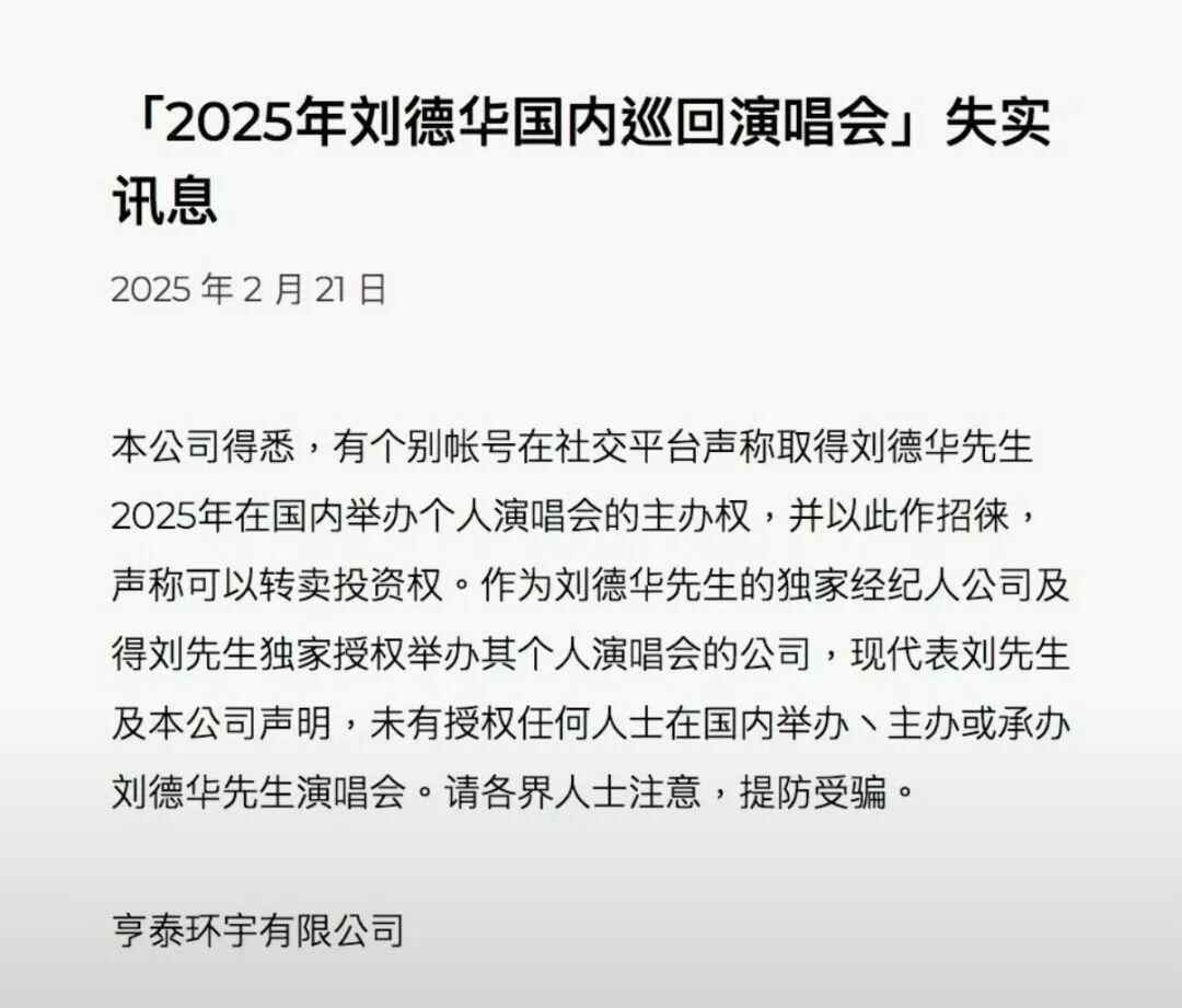 该声明表示,目前有个别账号在社交平台声称将主办刘德华2025年的国内个人演唱会,并声称可以转卖投资权。作为刘德华的独家经纪人公司以及获得刘德华独家授权举办其个人演唱会的公司,“亨泰环宇”代表刘德华声明:“未有授权任何人士在国内举办、主办或承办刘德华先生演唱会。请各界人士注意,提防受骗。”