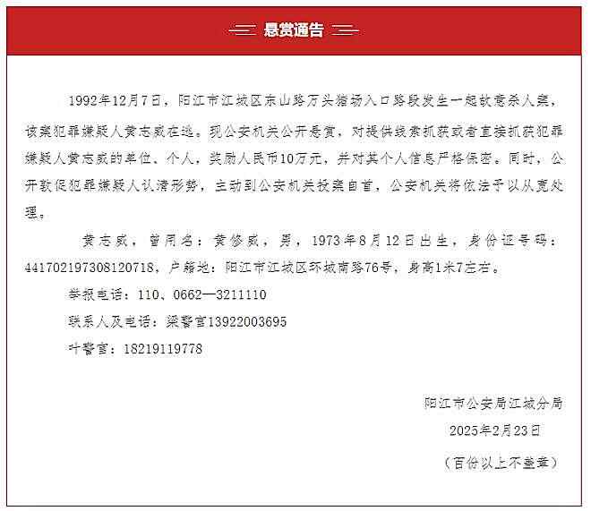 2月23日,广东阳江市公安局江城分局官方微信公众号“江城公安”发布一则《悬赏通告》称,1992年12月7日,阳江市江城区东山路万头猪场入口路段发生一起故意杀人案,该案犯罪嫌疑人黄志威在逃。现公安机关公开悬赏,对提供线索抓获或者直接抓获犯罪嫌疑人黄志威的单位、个人,奖励人民币10万元,并对其个人信息严格保密。同时,公开敦促犯罪嫌疑人认清形势,主动到公安机关投案自首,公安机关将依法予以从宽处理。