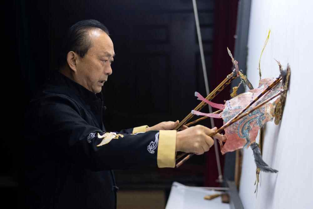 在位于阆中市的四川王皮影艺术博物馆,王彪展示如何操作影人(2月19日摄)。