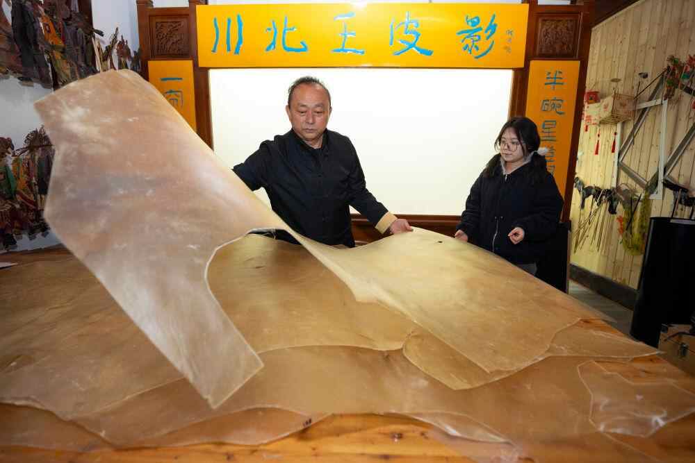 王彪(左)和徒弟陈静在挑选用于制作影人的牛皮(2月19日摄)。