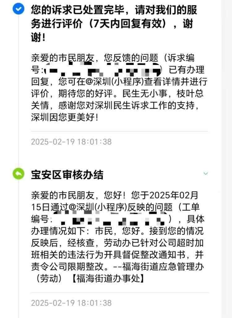 对此小刘表示,自己反映的情况均属实,辞职后,他曾向深圳市12345热线投诉反馈,福海街道劳动办随即介入调查。小刘提供的审核办结通知截图显示,目前劳动办已针对该公司超时加班相关的违法行为开具督促整改通知书,并责令公司限期整改,“经当地劳动部门协调,我已经拿到了应得的全部工资共计1079元。”