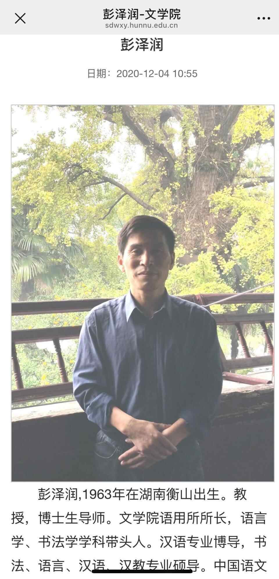 潮新闻记者在湖南师范大学文学院官方网站上看到,彭泽润是文学院语用所所长,语言学、书法学学科带头人。汉语专业博导,书法、语言、汉语、汉教专业硕导,并担任中国语文现代化学会副会长,语言理论分会理事长。