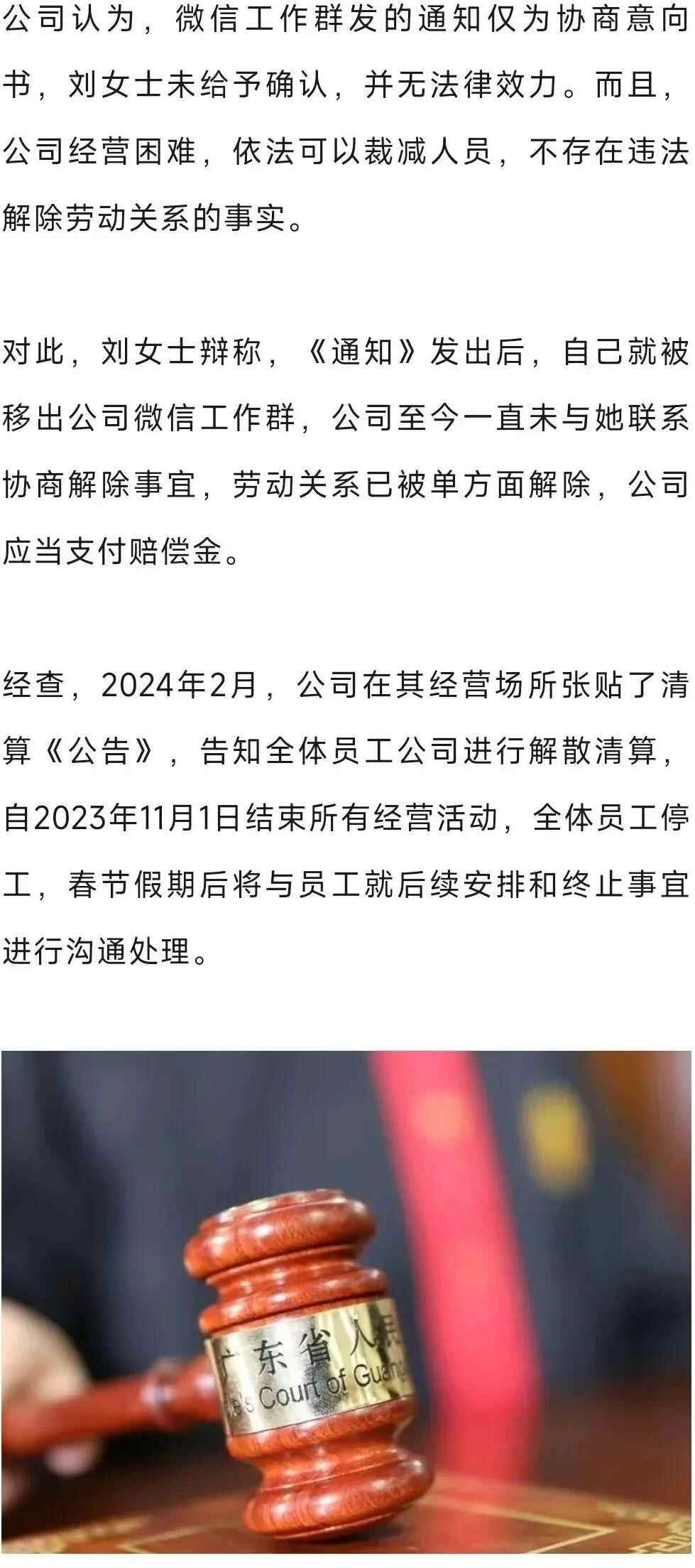 法院经审理认为,刘女士虽然未与公司签订书面劳动合同,但其已在员工手册上签字并连续工作多年,双方构成无固定期限劳动合同关系。公司在微信工作群发送的《通知》,依法应视为公司行为。