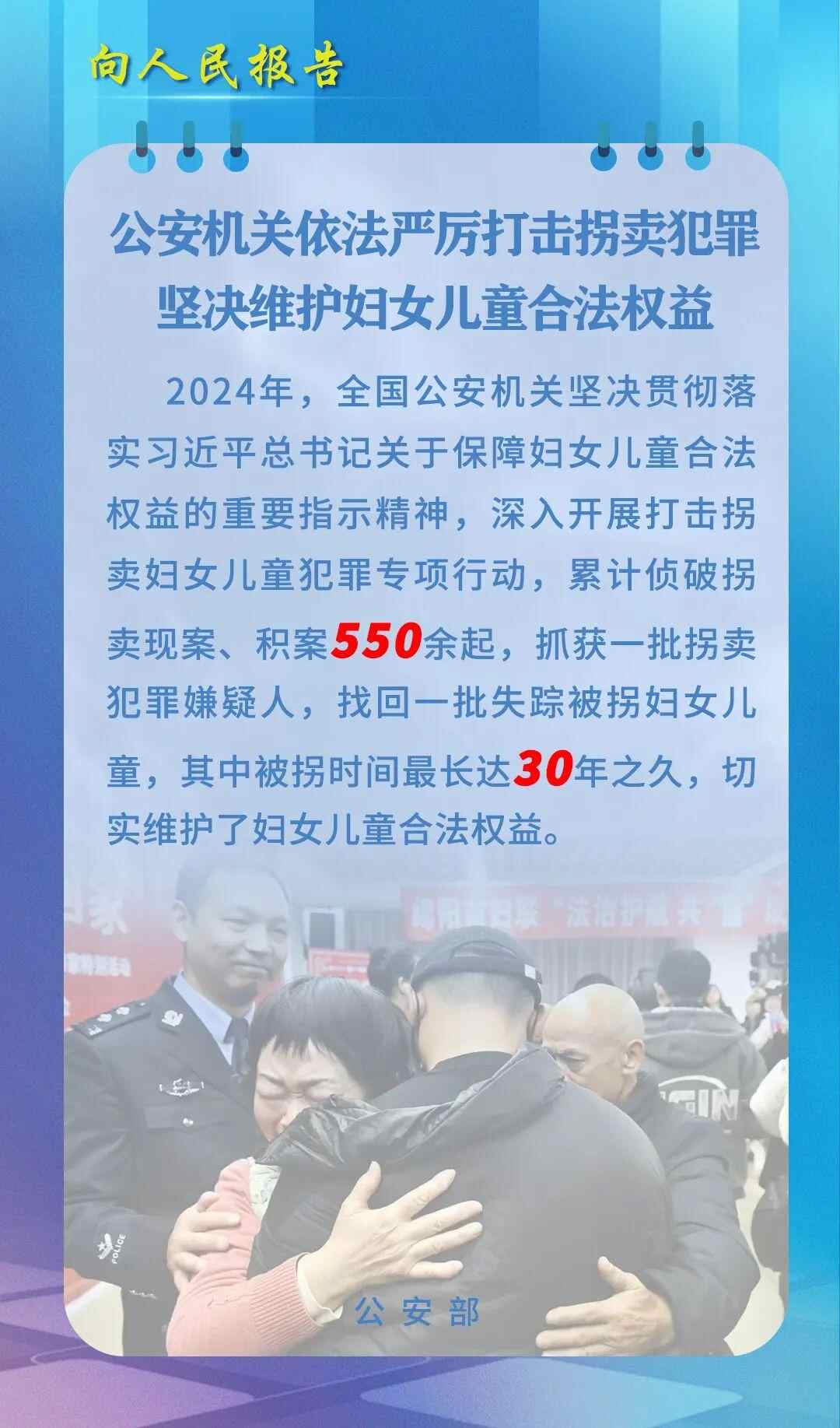2024年,全国公安机关坚决贯彻落实习近平总书记关于保障妇女儿童合法权益的重要指示精神,深入开展打击拐卖妇女儿童犯罪专项行动,快侦快破拐卖现案,集中攻坚拐卖积案,累计侦破拐卖现案、积案550余起,抓获一批拐卖犯罪嫌疑人,找回一批失踪被拐妇女儿童,其中被拐时间最长达30年之久,切实维护了妇女儿童合法权益。