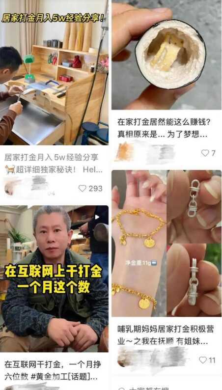 靠居家开金店“暴富”的案例不胜枚举。一位名为“王老师教打金”的博主就在自媒体上晒出自己开了40平方米的打金店、半年掘金百万的故事。