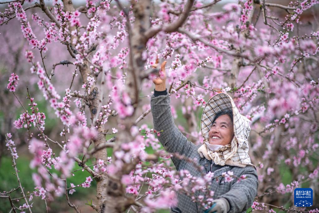 2月24日,在云南省文山壮族苗族自治州文山市马塘镇珍珠蜜桃基地,农民辛勤护理桃花。