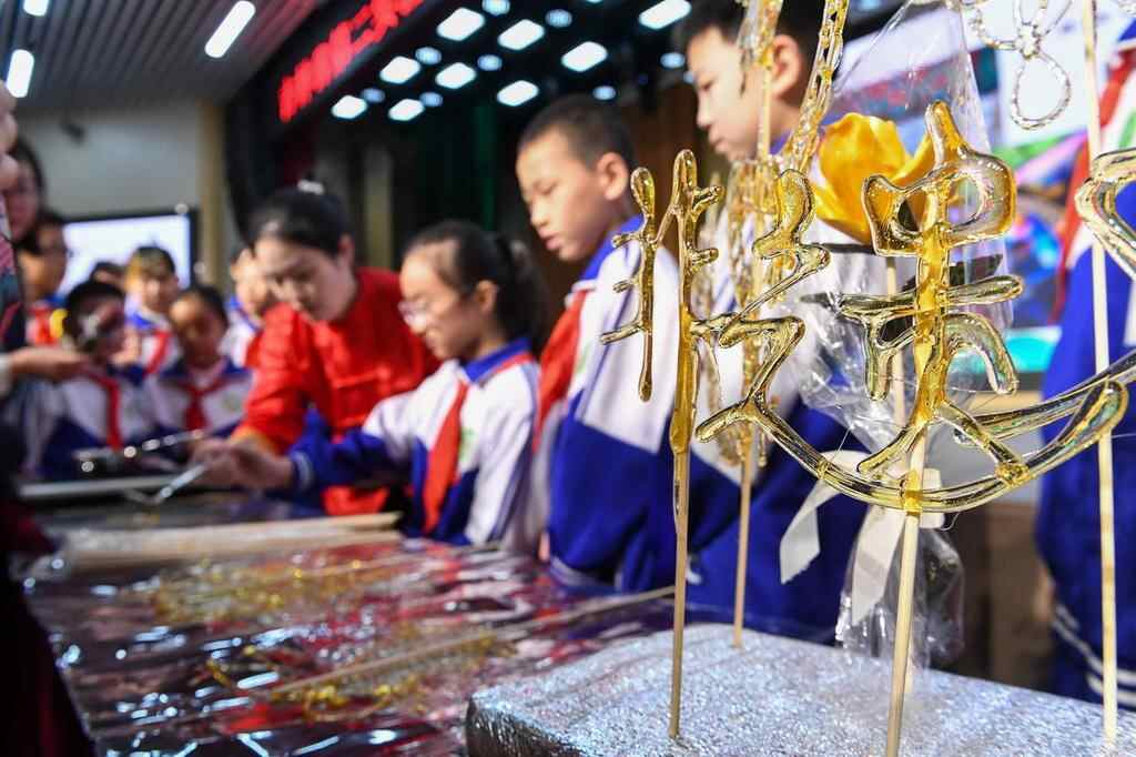 2月24日,在吉林省第二实验朝阳学校,学生们学习制作糖画。