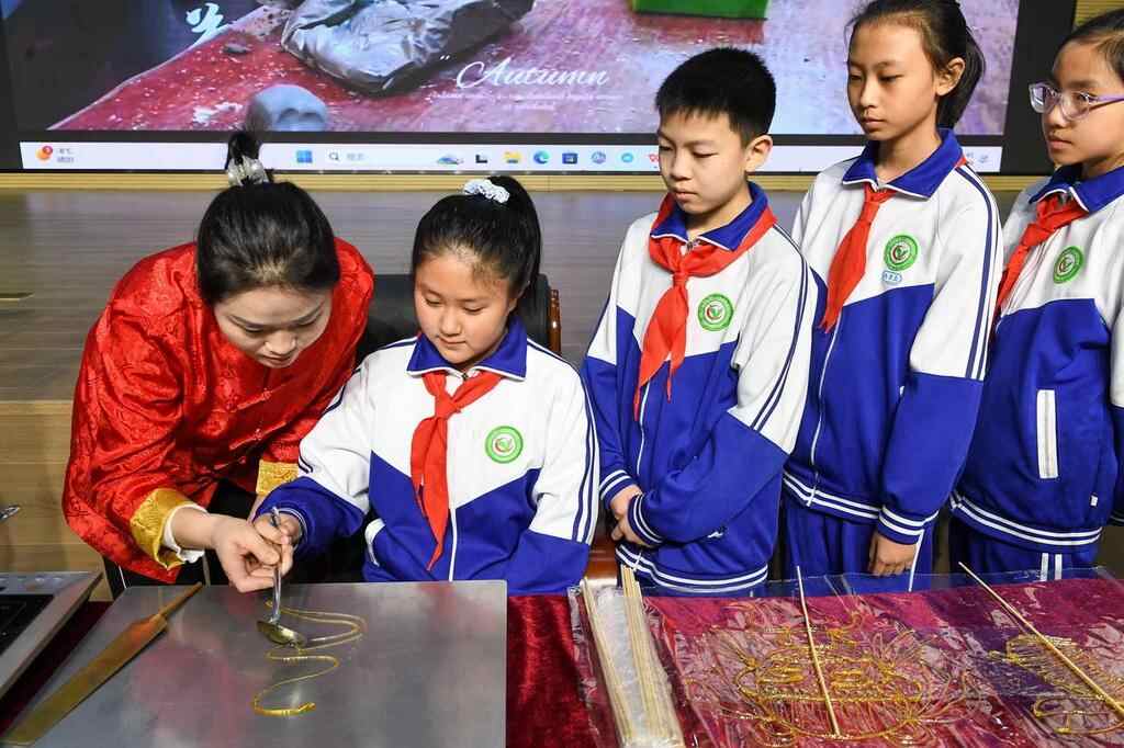 2月24日,在吉林省第二实验朝阳学校,糖画艺人董露露(左一)指导学生制作糖画。