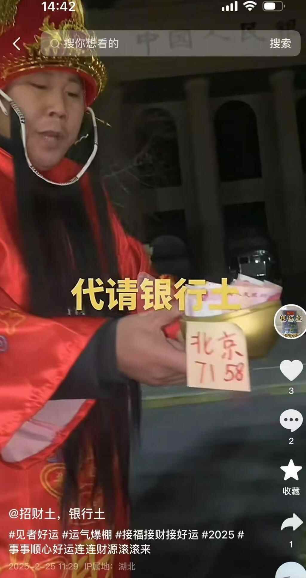 在抖音平台,博主“招财土,银行土”拥有1.3万粉丝,并且几乎每天都在更新“代请银行土”的视频。视频中,博主在夜里出现在不同银行网点前的绿化带处,用小铲子将绿化带泥土装入一个有买家地区和代码的金色小碗中。在挖掘过程中,他嘴里不断念叨着“顺风顺水顺财神”。