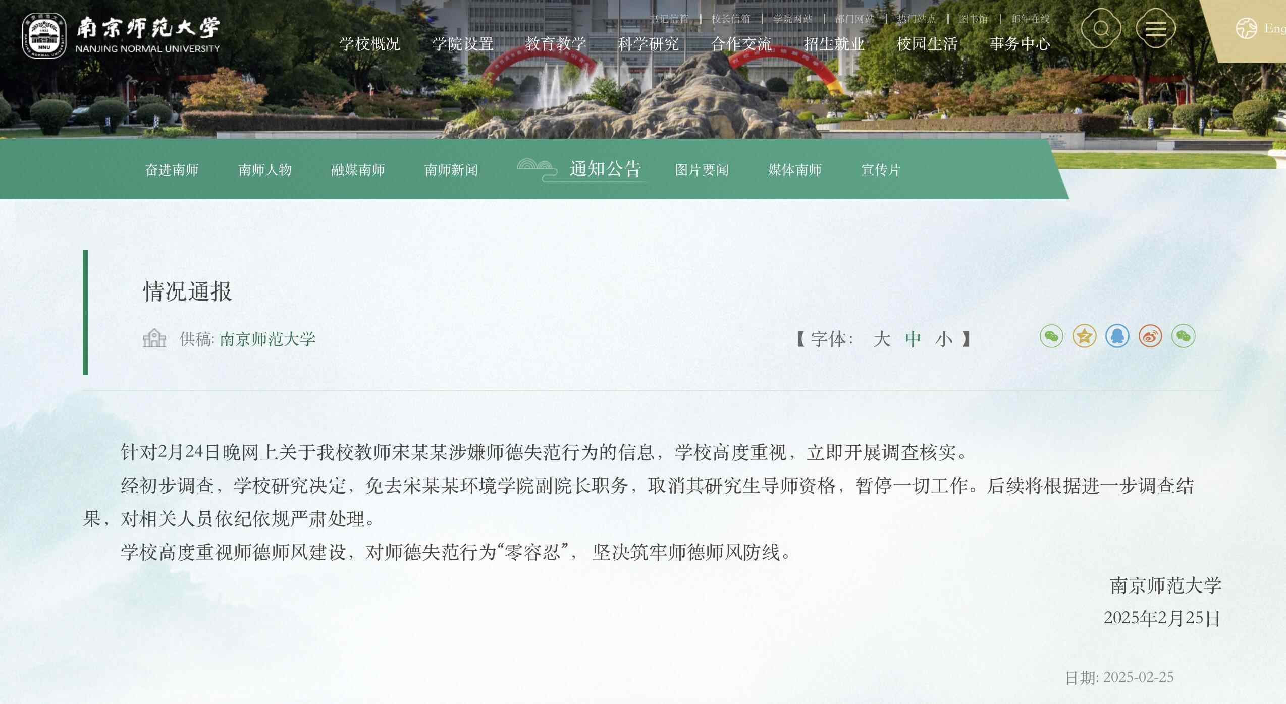 2月25日,南京师范大学通报:
