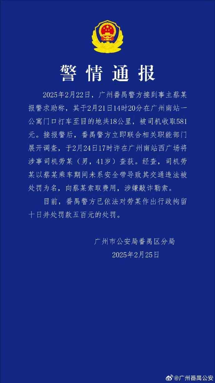 2025年2月22日,广州番禺警方接到事主蔡某报警求助称,其于2月21日14时20分在广州南站一公寓门口打车至目的地共18公里,被司机收取581元。接报警后,番禺警方立即联合相关职能部门展开调查,于2月24日17时许在广州南站西广场将涉事司机劳某(男,41岁)查获。