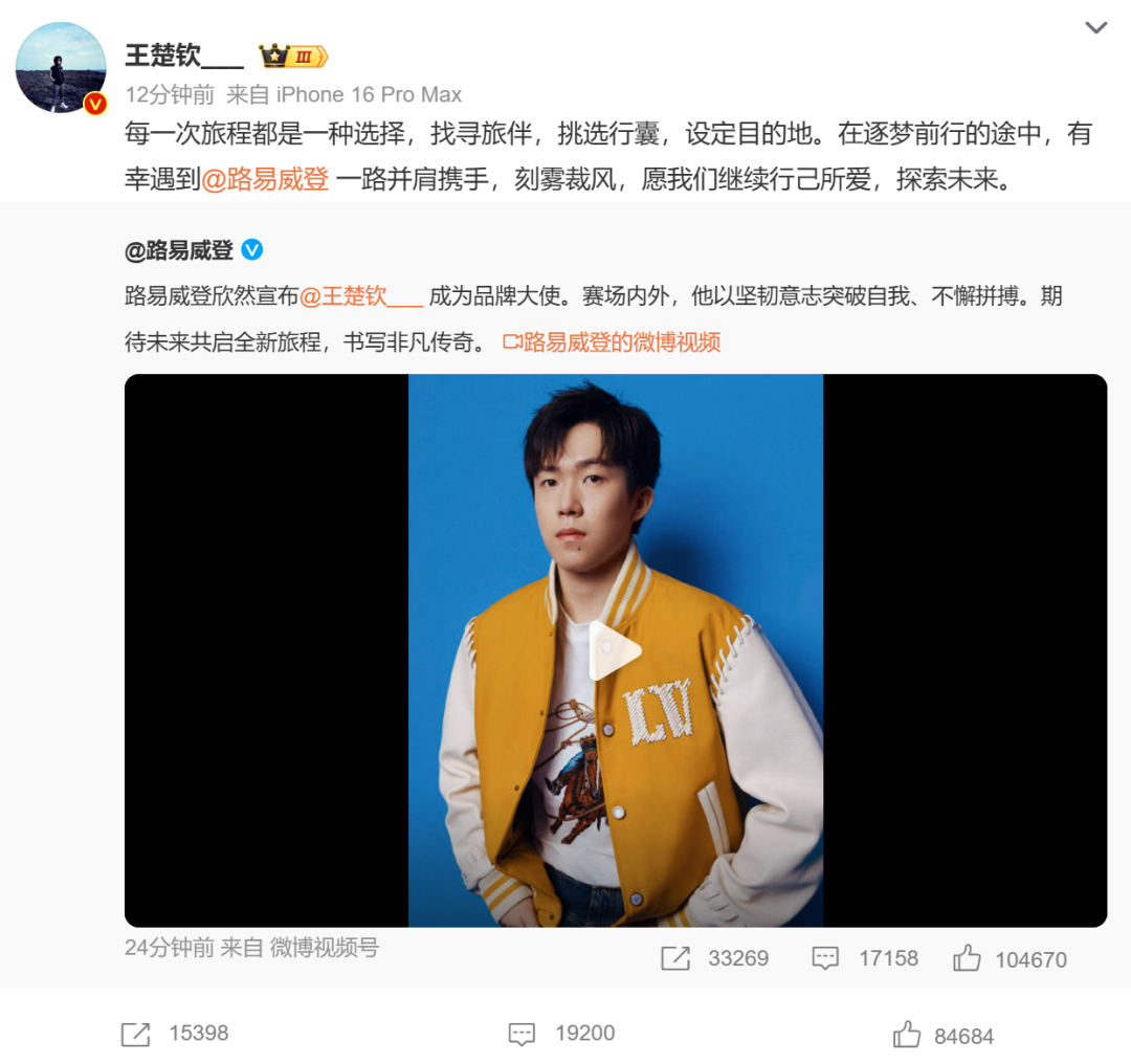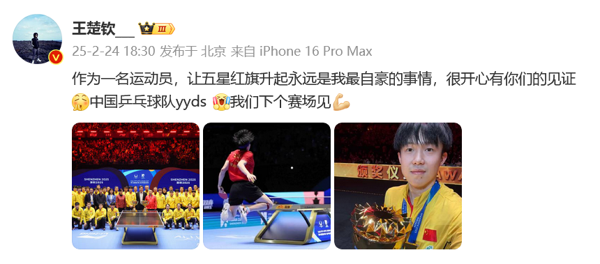 24日晚,王楚钦赛后发文:“作为一名运动员,让五星红旗升起永远是我最自豪的事情,很开心有你们的见证,中国乒乓球队yyds ,我们下个赛场见。”