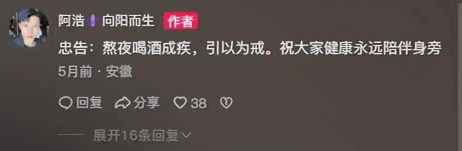 阿浩留下的忠告还挂在他的视频评论区,忠告:熬夜喝酒成疾,引以为戒。祝大家健康永远陪伴身旁。