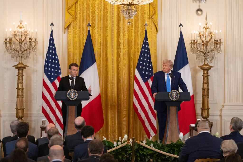 2025年2月24日,美国总统特朗普(右)在华盛顿白宫与到访的法国总统马克龙举行会谈后的联合记者会。新华社记者胡友松摄