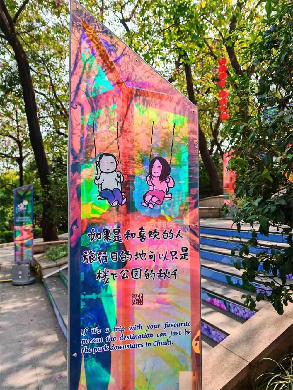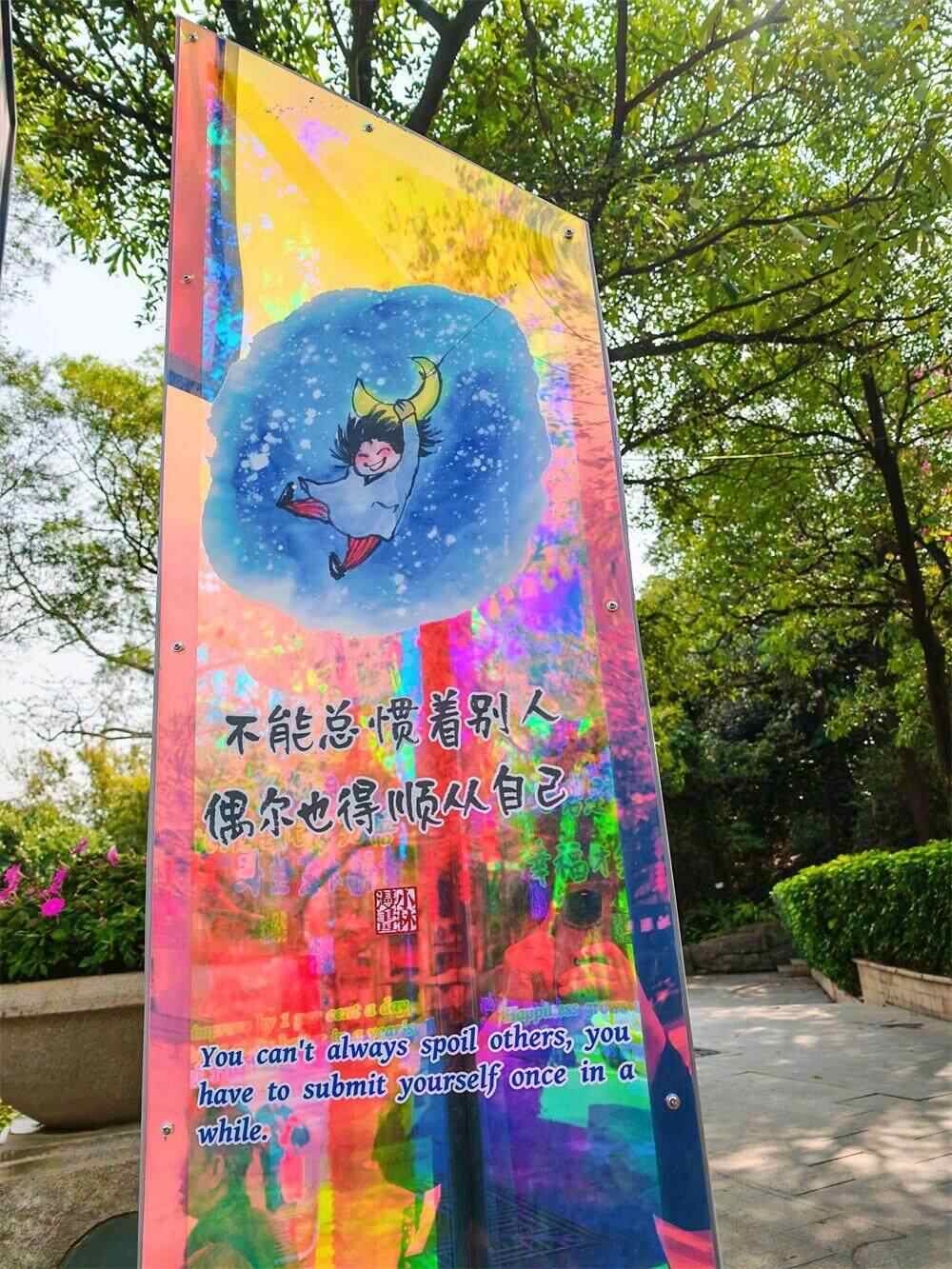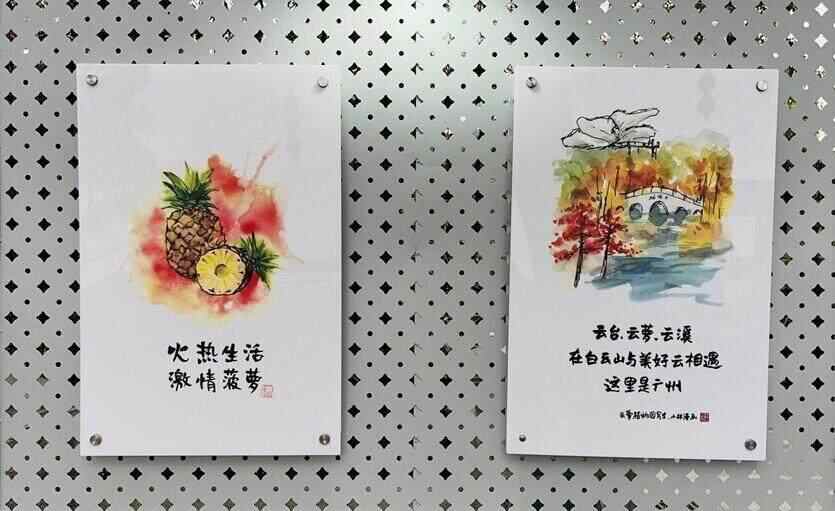 除了在白云山采风写生,小林老师还深入白云自然、人文地标及景点,描绘帽峰山、白云湖等自然景观,勾画白云国际机场、广州白云站、广州国际港等国际枢纽,还打卡三元古庙、石井桥等白云历史地标,描绘太和烧鸡、龙岗黄皮等舌尖上的白云美食。在轻盈透亮的亚克力板上,小林老师巧妙地将葱郁的山林美景勾勒出来,精心绘制的漫画搭配发人深省的幽默语言,营造出自然又富有哲理的艺术氛围,形成了一道道独特的风景线。