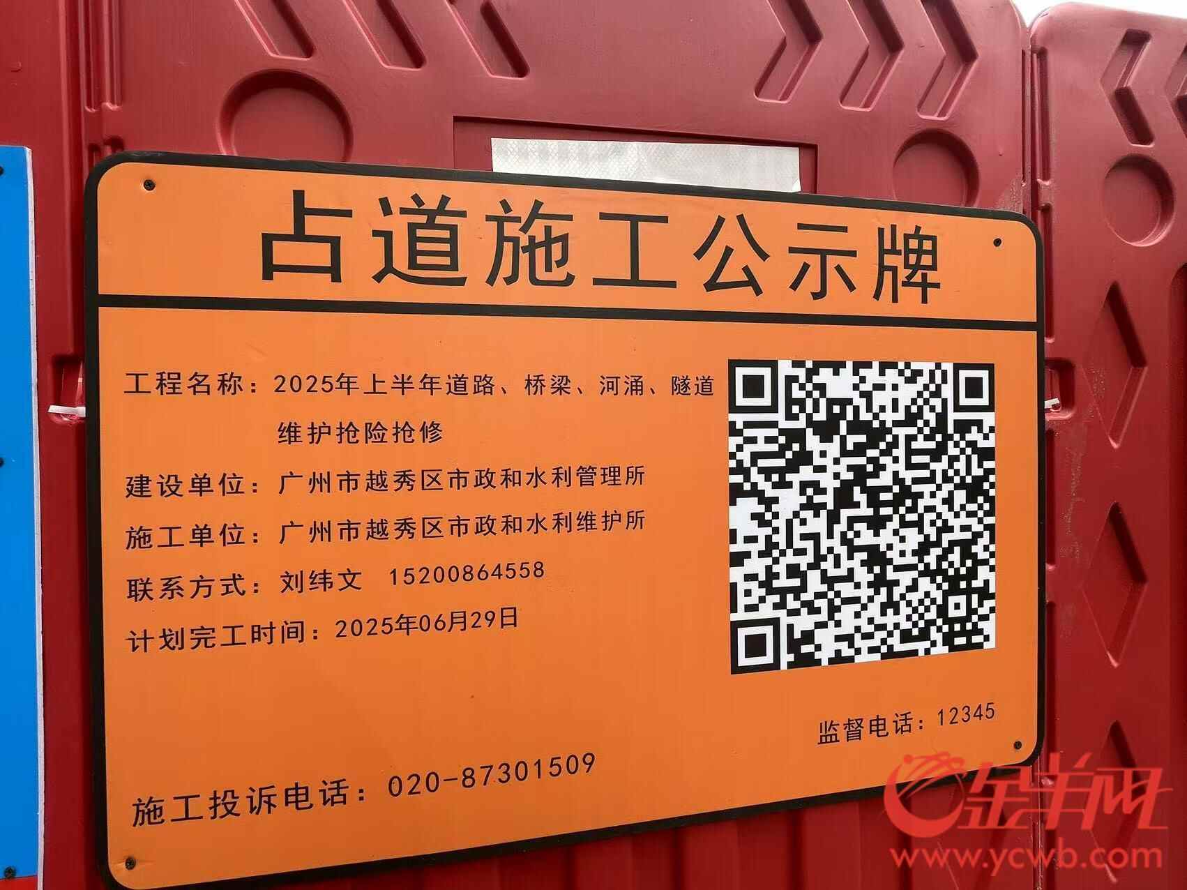 记者在施工工地外围发现了“占道施工公示牌”,该公示牌的工程名为2025年上半年道路、桥梁、河涌、隧道维护抢险抢修。