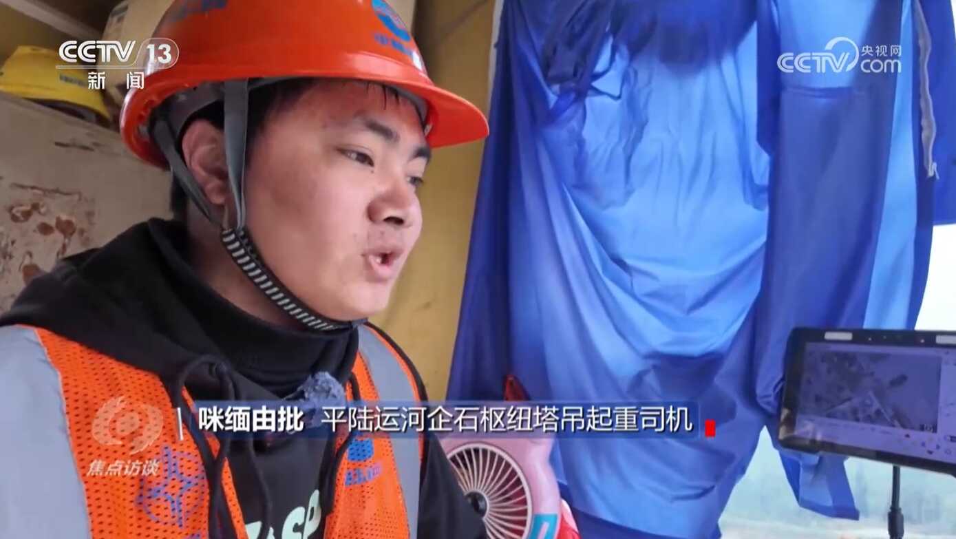 平陆运河企石枢纽塔吊起重司机咪缅由批:“第一次爬的时候是40米的那种(塔吊),刚开始就是特别害怕,腿也是发抖,一步一个脚印,就是冒着汗慢慢爬上来,然后练成了这个胆量,慢慢就习以为常了。”