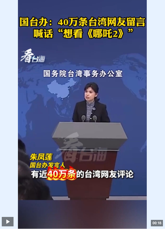 好电影自然有吸引力,《哪吒2》目前已经成为全亚洲首部过百亿、闯进全球影史票房榜前八的现象级华语影片。在2月26日的国台办例行新闻发布会上,发言人朱凤莲回应记者提问表示,有近40万条台湾网友评论呼吁尽快在台湾上映这部电影,我们希望台湾有关方面倾听民众呼声,让更多优秀大陆电影进入台湾影院,让台湾同胞能欣赏更多优秀文化产品。