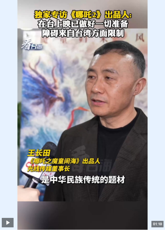 《哪吒之魔童闹海》(下文简称《哪吒2》)热映全球,票房、口碑双双表现惊艳,持续受到关注。至今还未能在台湾影院观看《哪吒2》的岛内民众纷纷喊话民进党当局,要求尽早引进这部电影。《哪吒2》出品人、光线传媒董事长王长田表示,“大陆已做好在台湾上映的一切准备。”