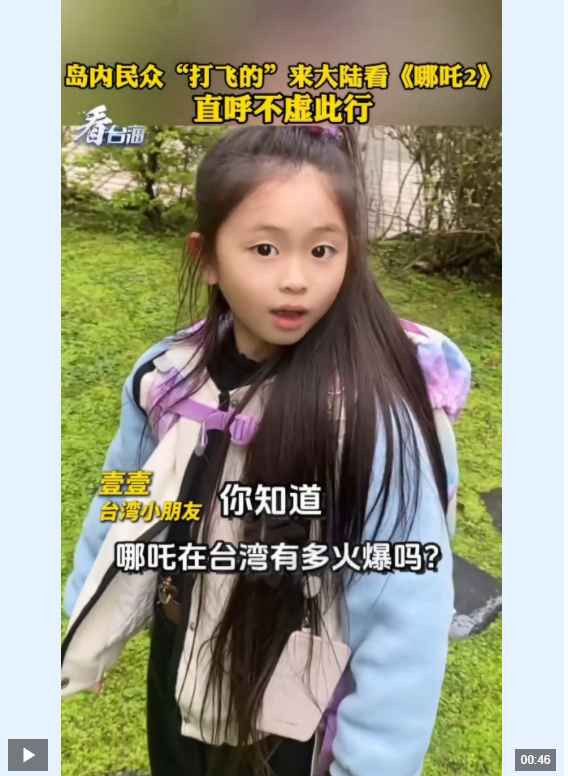 近段时间,不少实在等不及的岛内影迷选择“打飞的”来大陆看《哪吒2》。其中,台湾小女孩壹壹表示很期待《哪吒2》来台湾,“我台湾的老师和同学们都很羡慕我,他们都超级想看这部电影”。台湾中华海峡经贸交流协会理事长苏恒专程到厦门观影后说,“不虚此行,台湾有超多哪吒三太子的信徒,都很期待在台湾影院看《哪吒2》”。金门同胞吴将民来大陆看完《哪吒2》后,不仅强烈推荐身边朋友也去看,甚至想在大陆来个“哪吒深度游”。