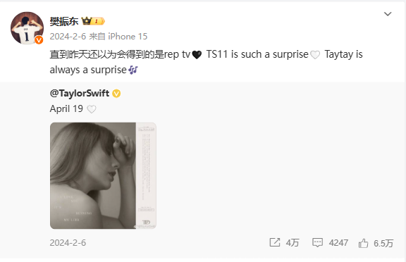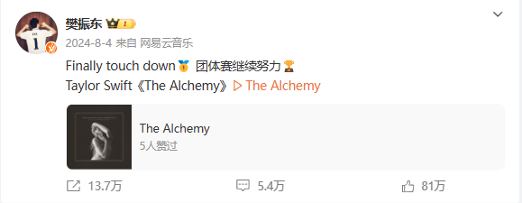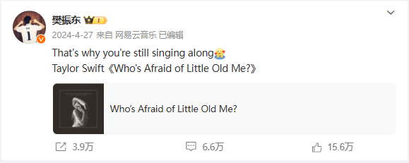 在巴黎奥运会获得乒乓球男子单打金牌后,樊振东分享了一段泰勒的歌词,并鼓励自己团体赛继续加油。其实,他已经多次在微博分享泰勒的相关内容,可见他对其的喜欢。