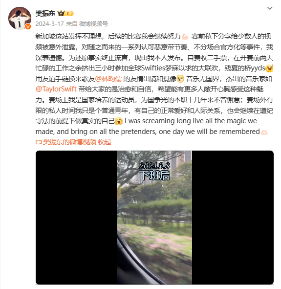2024年3月,樊振东还发布了一条和林昀儒一起去看泰勒演唱会的vlog。