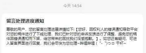 2月27日,金刚主人收到哔哩哔哩平台对于稿件申诉的处理结果:“因权利人的错误通知导致平台对您的稿件进行了下线处理,我们已针对您的申诉反馈进行了调整,避免您的稿件因错误通知而下架,给您带来的困扰我们深感抱歉。”