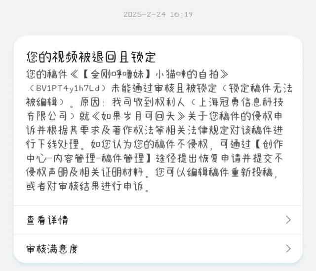 2月24日,她在哔哩哔哩平台收到了官方提醒,称视频未能通过审核且被锁定,原因为收到权利人(上海冠勇信息科技有限公司)就《如果岁月可回头》关于视频的侵权申诉并根据要求及著作权法等相关法律规定对该视频进行下线处理。当天,她向客服反馈,客服称已恢复视频。但次日,她又收到了同样的提醒,内容不变,视频再次被下架。经过再次反馈后,该视频恢复正常。