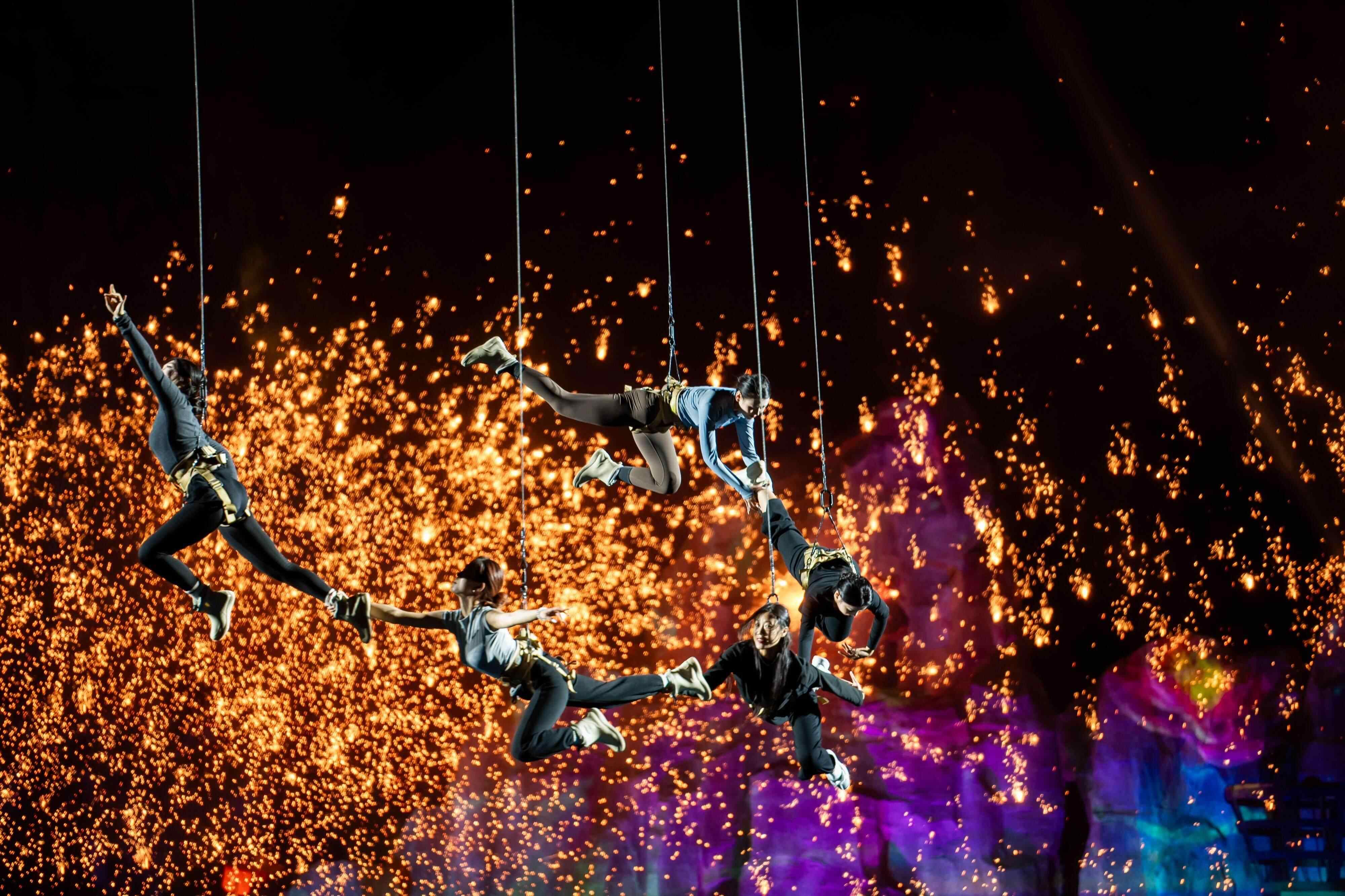 而舞台上的表演更是精彩绝伦。裸眼3D、巨型水幕投影、高空威亚表演、特效火炬与舞台灯光组合……现代舞台表现手法的运用,让演出更加饱满。最令人感到震撼的当属山体打铁花表演。主创团队特别搭建一座超过12层楼高的山体,十多处点位同时击打出壮丽铁花。铁花绽放时,光影交错,如同夜空中闪烁的繁星。