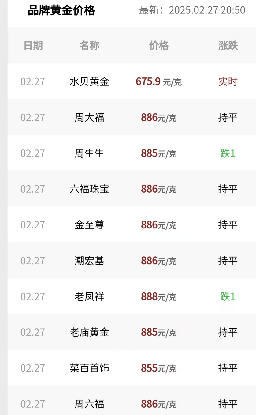 周大福、六福珠宝、周生生等品牌黄金价格从逼近900元/克回落至886元/克关口。