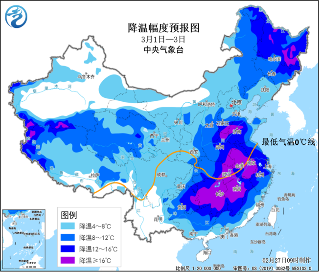 受冷空气和雨雪影响,各地气温也将明显下降。孙倩倩表示,由于前期基础气温高,中东部多地将出现短时间内的猛烈降温,隔天如换季,降温强度可达寒潮级别。3日前后,最低气温0℃线将南压到江汉至沿淮河一带。寒潮过后,江南中北部及其以北大部地区气温将由前期偏高转为偏低或接近常年同期。