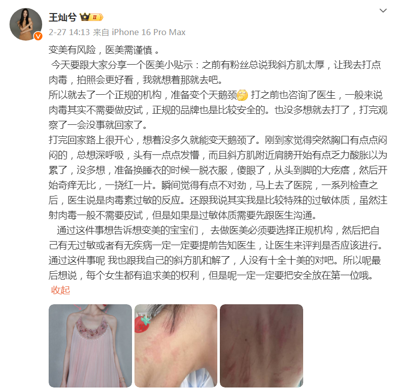 王灿此前因粉丝多次评论“斜方肌过厚”,选择前往正规机构注射肉毒杆菌,希望通过医美改善体态。但注射前未主动告知医生自身是过敏体质,且未进行皮试(常规操作中肉毒素注射通常无需皮试),导致药物引发全身过敏反应。