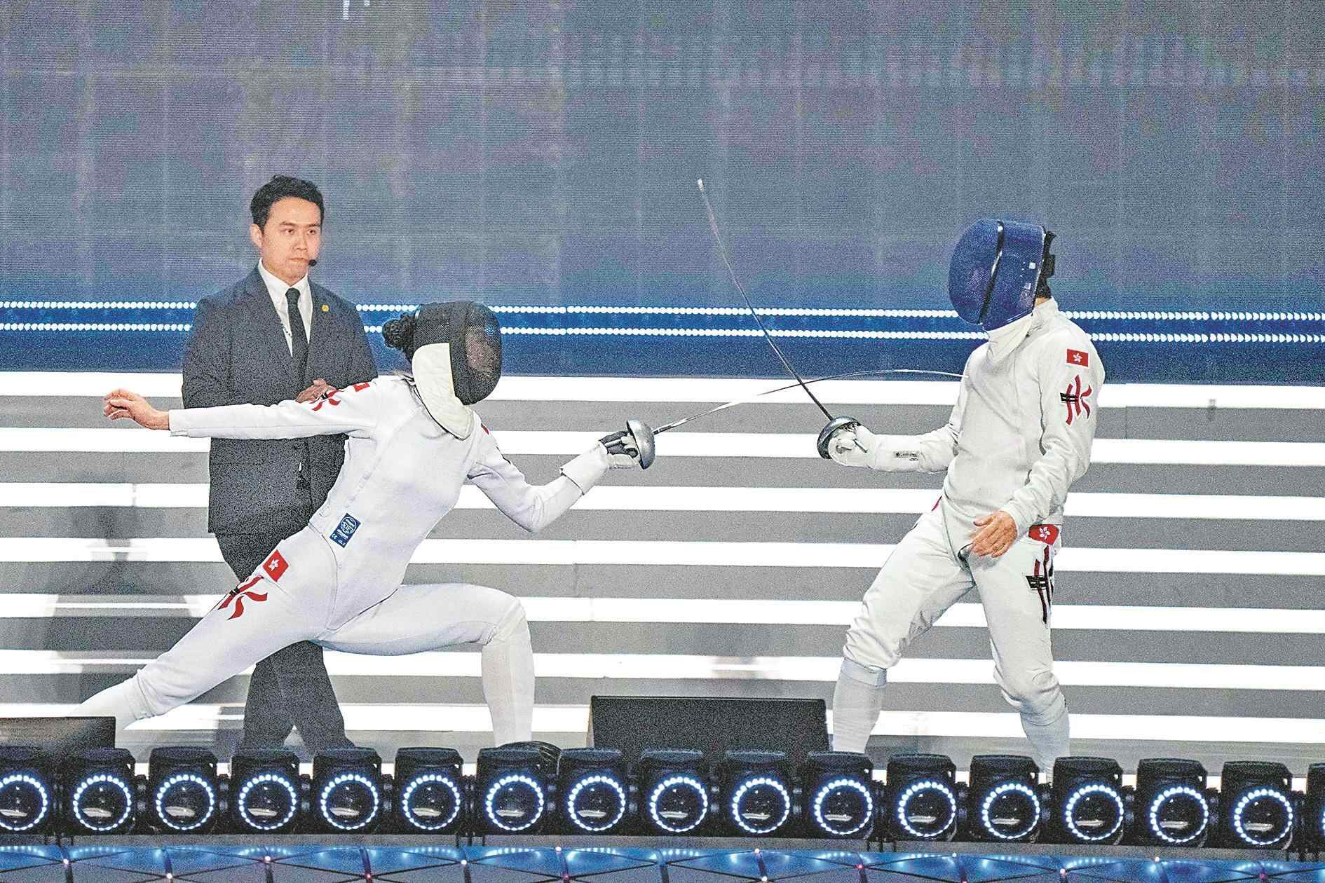 在“力争上游”环节,已退役的香港击剑运动员、“微笑剑后”江旻憓携手“宇宙最强”甄子丹,上演别开生面的《狮子山下·华山论剑》。随后,国家乒乓球队运动员樊振东、香港乒乓球队代表杜凯琹和黄镇廷、香港羽毛球队代表邓俊文和谢影雪、羽毛球名将林丹等相继亮相互动,掀起活动高潮。