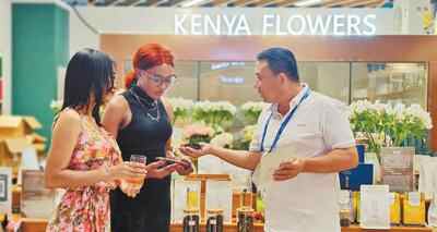 第三届中非经贸博览会期间,肯尼亚紫茶代理商(右一)向参展者介绍肯尼亚紫茶。