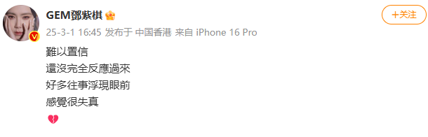 3月1日晚,邓紫棋在新加坡演唱会上泪流满面悼念方大同。之前,她获悉方大同去世后,曾在社交平台上写道:“难以置信,还没完全反应过来,好多往事浮现在眼前,感觉很失真。”